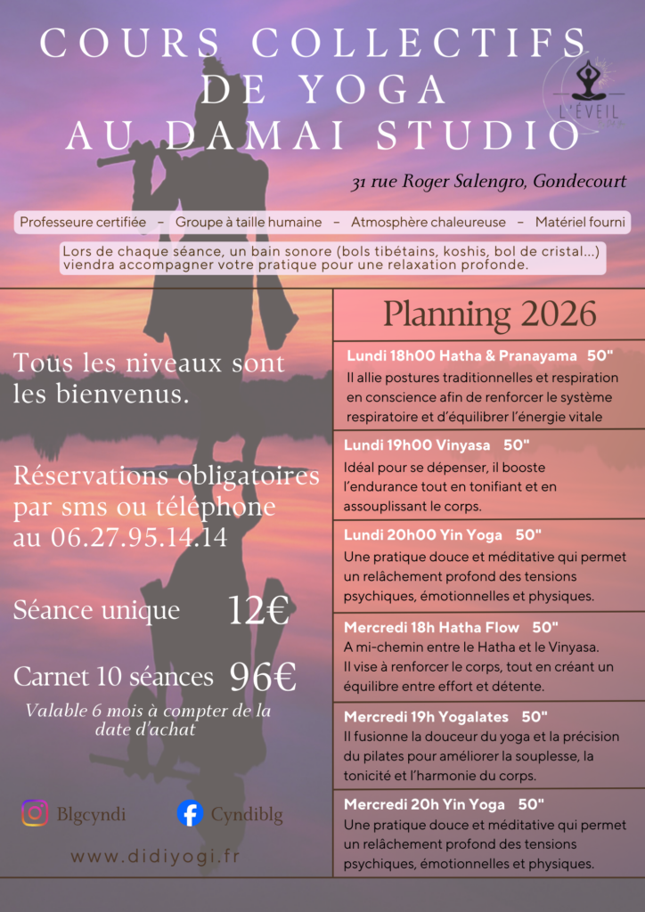 Retrouvez-moi chaque lundi et mercredi pour des cours collectifs de yoga au Damaï Studio, à Gondecourt. Ce lieu chaleureux, pensé pour le sport, le bien-être et la détente, vous accueille pour un moment de reconnexion à vous-même et aux autres.